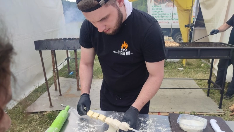 Вот одна из таких точек. Возле стола рядом с мангалом сгрудилась толпа — мастер-класс по приготовлению необычного хачапури.