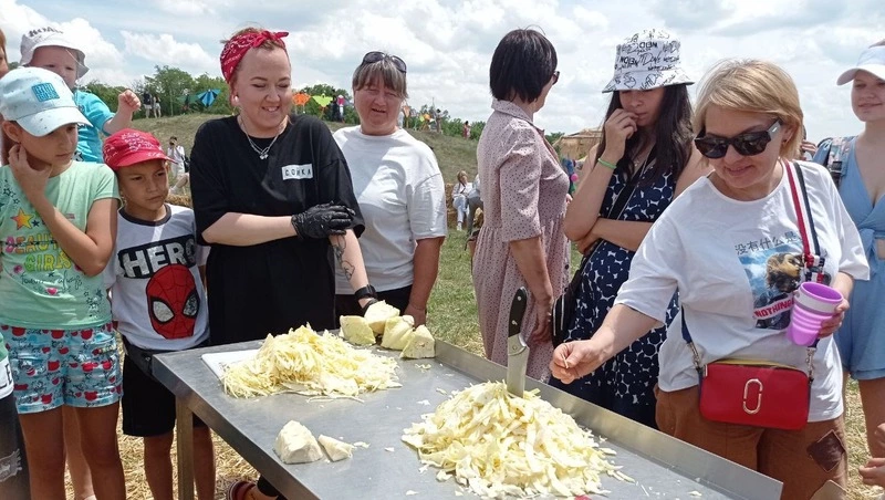 А чуть поодаль, в очерченном тюками соломы кругу, назревает битва. Битва шефов. Вооружённые острыми ножами повара приближаются к столику с вилками капусты. Кто лучше справится с задачей? Замелькали в воздухе быстрые лезвия. Один завершил шинковку быстрее, у второго — кочан нарезан тоньше и аккуратнее. Быстрый признаёт поражение, диплом вручают автору красивой шинковки.
